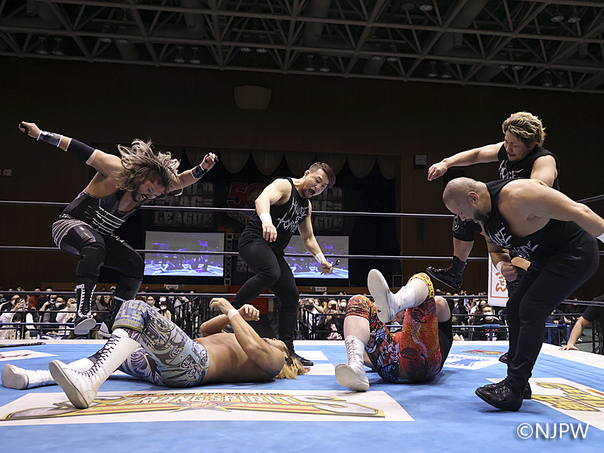 すかさず東郷がレフェリーの気をそらし、このスキに裕二郎がスティックを狙ったものの、棚橋はカウンターの低空ドロップキックで阻止。逆に矢野がEVILと裕二郎の急所を背後から撃ち抜くや、勝負どころとみた棚橋がスリングブレイドからのハイフライアタック、そしてハイフライフローで仕留めにかかった。