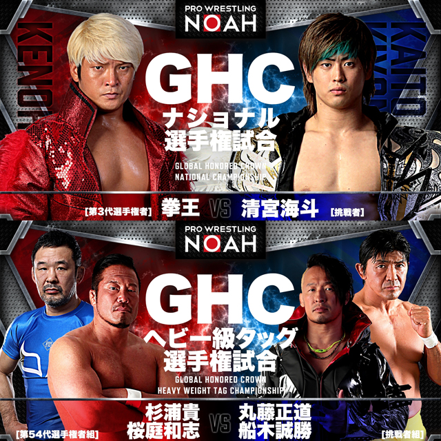 ノアは28日、11・22横浜武道館大会の追加カードなどを発表。GHCナショナル選手権試合「(選手権者)拳王vs清宮海斗(挑戦者)」、GHCタッグ選手権試合「(選手権者)杉浦貴&桜庭和志vs丸藤正道&船木誠勝(挑戦者)」、GHCジュニアヘビー級タッグ選手権試合「(選手権者)原田大輔&小峠篤司vs小川良成&HAYATA(挑戦者)」などが新たに決まった。