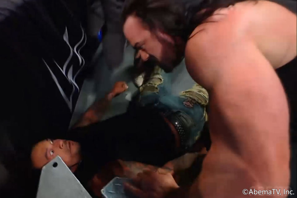 するとダミアンが戻ってきた。セキュリティ勢を振り切ってマッキンタイアに殴りかかると、ラリアットで場外に叩き落として追いかけ、鉄階段に叩きつける。マッキンタイアもサミングで応戦し、鉄階段でダミアンの顔面を殴打。それでも飽き足らず鉄階段上でフューチャーショックDDTを容赦なく敢行した。ダミアンは目を見開いて大の字。マッキンタイアはダミアンからネックレスを引きちぎって勝ち誇った。