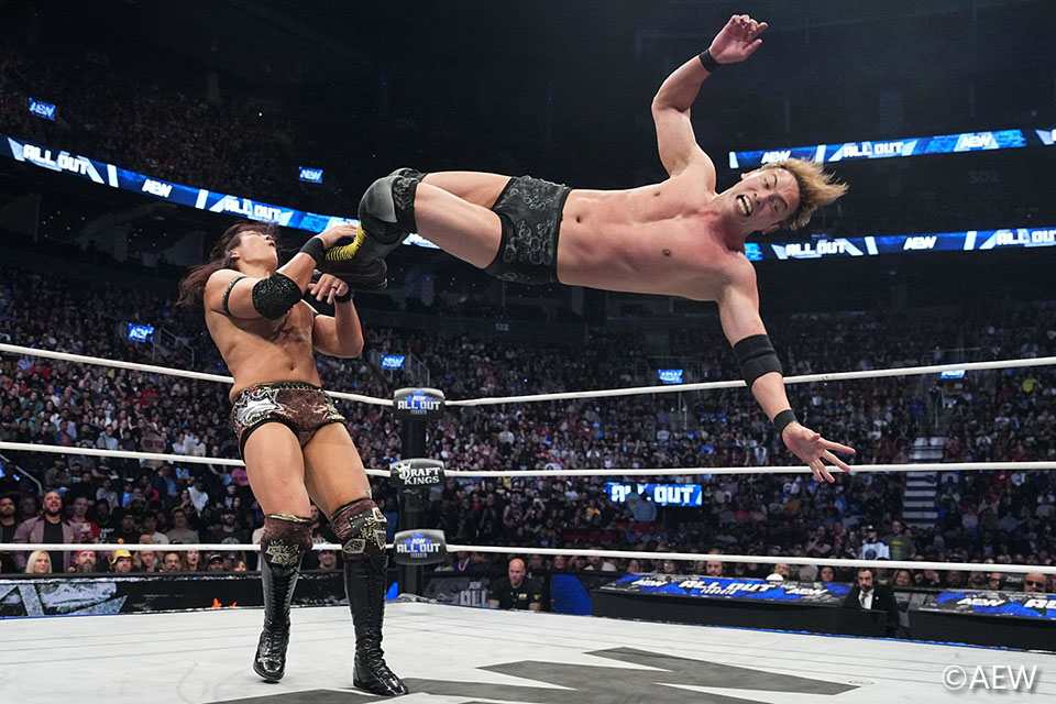 『AEWオール・アウト』が現地時間20日、カナダ・オンタリオ州トロントで行われ、オカダ・カズチカがKONOSUKE TAKESHITA、マスカラ・ドラダとの3WAY戦を制してAEWユニファイド王座を死守した。