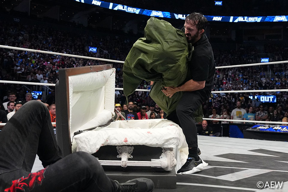 『AEWオール・アウト』が現地時間20日、カナダ・オンタリオ州トロントで行われ、ジョン・モクスリーがダービー・アリンと棺桶マッチで対決。復帰したPACの援護射撃を受けて勝利した。