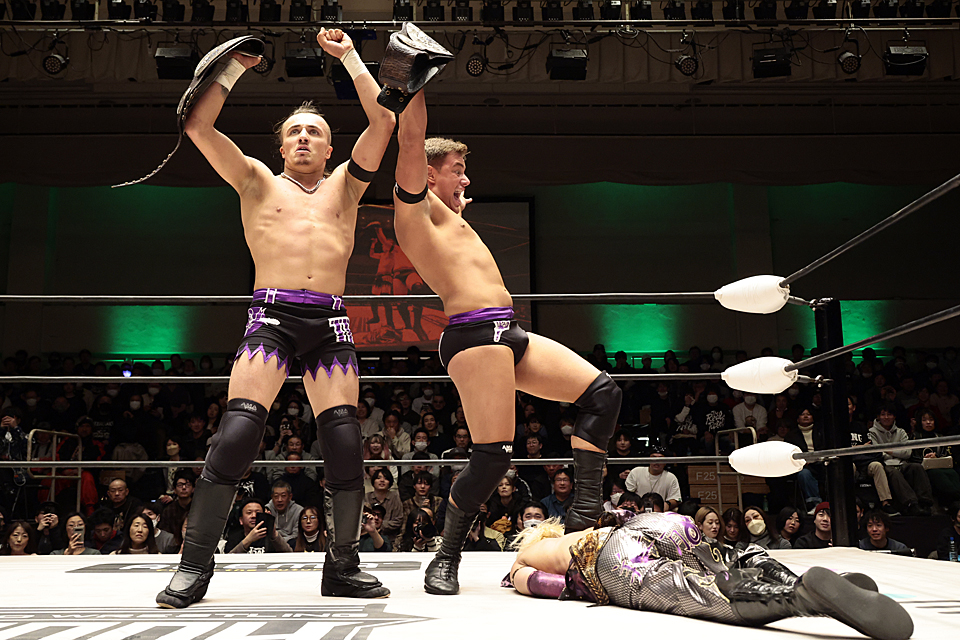 いきなり大きなインパクトを残した“荒くれ"英国コンビ。続く2・15横浜大会では“TBA"Eita&小田嶋大樹組と対決する。