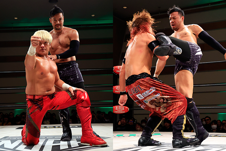 ALL REBELLIONを離脱して新たな一歩を踏み出した拳王も、コスチュームを赤いロングタイツに戻して再出発。中盤過ぎにはKENTAと肩を組んでのダブルビッグブーツや、KENTAのソバット→拳王の右ハイキックの連係もズバリと決まる。そしてKENTAのダイビングフットスタンプ→拳王のPFSとたたみかけるや、最後はKENTAがgo 2 sleepで憂流迦から完璧な3カウントを奪ってみせた。