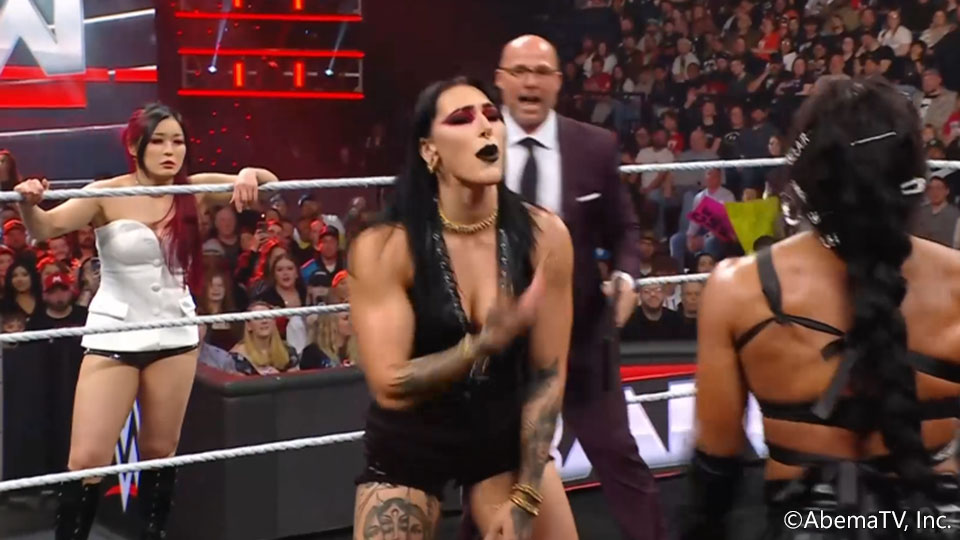 ロウが現地時間7日、で行われ、イヨ・スカイが『レッスルマニア41』(4・19&20ラスベガス)でリア・リプリー、ビアンカ・ベレアとの女子世界王座トリプルスレット戦が正式決定。挑戦者二人に怒りの先制打を放った。