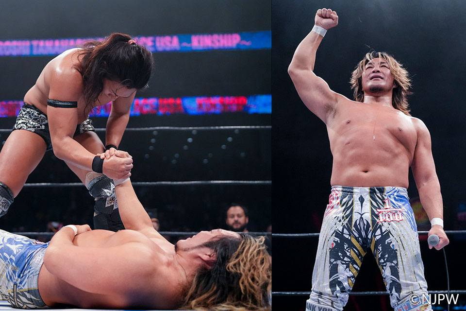 TAKESHITAが10年8ヵ月ぶりの再戦でリベンジを成就。棚橋はアメリカラストマッチを勝利で飾れず終わった。試合後、棚橋は大の字。TAKESHITAが右手を差し出すと、倒れたまま握手に応じた。