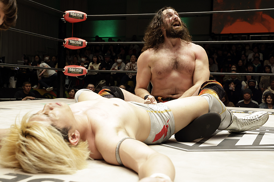 この日の後楽園大会で早速前哨戦。「JONETSU!!」と叫びまくってガレノと真っ向から巨体をぶつけ合ったサクソンは、猛烈なクロスボディアタックでガレノを押し込んで場内をどよめかせる。ならばと切れ込んできた清宮からタイガースープレックスで投げられても、むっくり立ち上がって猛烈なビッグブーツをさく裂だ。続けざまに落差十分のネックハンギングボムで叩きつけ、清宮からあれよあれよと3カウントを奪ってみせた。