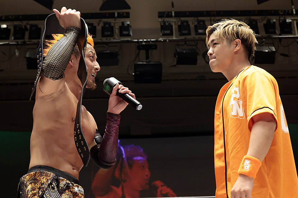さらに鮮やかなオレンジに染髪していたYO-HEYは「もちろん防衛するのはオイラYO-HEYちゃんや。そしてお前のイメージカラーのオレンジ、オイラのものにしたんぞ」とも予告。昨年末にシングルマッチでは宮脇に軍配。今年に入ってもジュニアタッグ戦線で星の奪い合いを展開してきた両雄による対決が、今度は頂上王座を懸けて行われることが決定的となった。