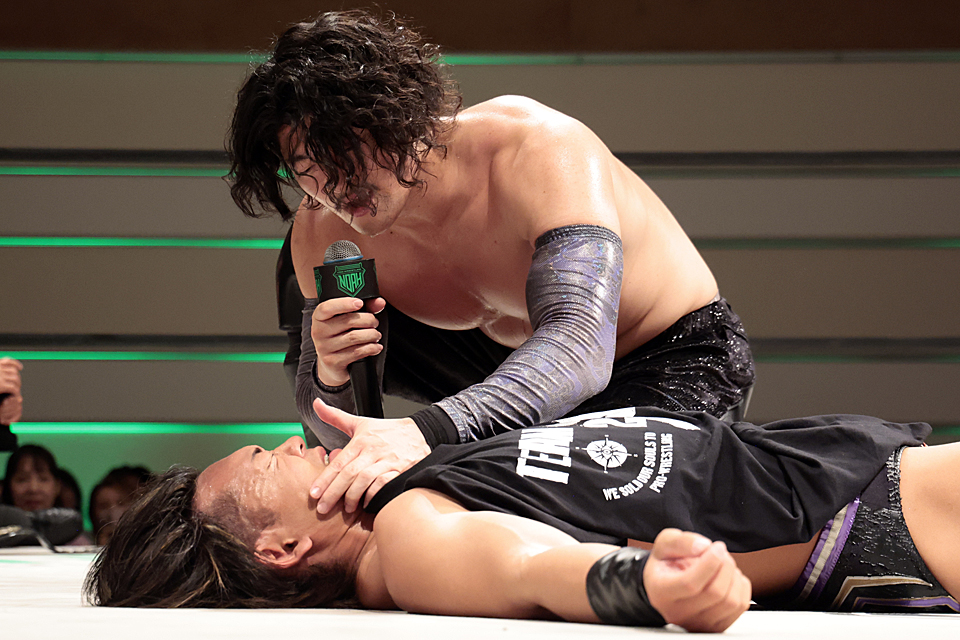 『SUNNY VOYAGE 2025』横浜ラジアントホール(2025年5月24日) ○遠藤哲哉&丸藤正道vsダガ&OZAWA× 6・3後楽園大会のGHCヘビー級王座戦へ王者OZAWAが挑戦者・遠藤をTEAM 2000Xぐるみで公開処刑。T2000Xをを離脱した遠藤にT2000X・Tシャツを強制装着すると「もう一度頭を冷やして考え直せ」と迫った。 勝ち残りのサバイバル3WAY形式で争われるGHCヘビー級王座戦「(王者)OZAWAvs(挑戦者)遠藤vs(挑戦者)杉浦」に向けた2度目の前哨戦。前夜の会津若松大会で行われた前哨戦第1ラウンドでは、白コスチュームにモデルチェンジした遠藤がOZAWAの面前で快勝していた。 遠藤をT2000X離脱へと導いた杉浦は不在だったものの、第2Rとなったこの日の横浜大会では遠藤&丸藤組が実現。OZAWA&ダガ組と対決した。 未練を捨てきれぬOZAWAは序盤から遠藤を説得するが、遠藤は「もう仲間じゃねえよ」と一蹴する。これにブチ切れたOZAWAは遠藤を場外に連行。観客席に投げつけ、パイプイスで背中を痛打するなどして暴行する。さらに、グッズ売り場からT2000XのTシャツを強奪し、倒れ込む遠藤に強制的に着させると、「似合ってるよ」と満足げに声をかけた。 遠藤は正攻法で必死の抵抗。Tシャツを脱ぎ捨てると、OZAWAのネックロックに捕まりながら「帰ってくるんだ」「思い出せ」と呼びかけられても、苦もんしながら「俺たちはもう敵なんだ」と勧誘を拒否する。激しい打撃戦をハンドスプリング式レッグラリアットで制して、自力でピンチを脱してみせた。 丸藤がダガとスピーディな先読み合戦を繰り広げると、その間に息を吹き返した遠藤がOZAWAに猛攻。命乞いするOZAWAに、ここでも「俺たちはもう仲間じゃない」と通告すると、丸藤のトラースキック→遠藤のエクスプロイダーがさく裂した。さらに、神の右膝でカチ上げて決定機を掴む。 しかし、T2000Xの面々がレフェリーのカウントを妨害。リング上に乱入して、総出で遠藤を痛めつける。レフェリーに止められても構わず、OZAWAはヨシ・タツから手渡されたトンファーで迷いなく遠藤を殴りつけてKO。反則負けの裁定が下っても、さらに黒の松葉杖でめった打ちにした。 裏切り者にみそぎの公開処刑…と思いきや、動かない遠藤を見やるOZAWAの視線は慈愛に満ちていた。マイクを握ったOZAWAは「杉浦貴! どこ行った! 出てこいよ!!」と白々しく不在の杉浦を呼び出すと、当然場内はシーン…。 そのうえで「おいエンテツ聞きなさい、杉浦貴というのはこういう男なんだ。お前が一人で一生懸命闘っているのにセコンドにすら就かない。俺たちTEAM 2000Xがお前を一人にしたことがあったか? 杉浦貴は自分のことしか考えてない悪い人間なんだ」と説明すると、「おい、エンテツ、俺たちは双子だっただろ? 忘れちまったのかよ? またビンタとかやってバンっって飛ばして元のエンテツにもどしてやろうか? お前の居場所はTEAM 2000Xにある。もう一度、頭を冷やして考えてこい」と再考を迫ってリングを後にした。 【OZAWAの話】「おい、遠藤哲哉。お前に必要なのはやっぱり張り手だな。張り手で目を覚まして、お前またいつでもさ、居場所はあるからさ。戻ってこいよ」 【遠藤の話】「今日でハッキリしたぞ。俺はT2000Xを抜けて大正解だ。俺のこの才能はあんなクソみてえなユニットで消費するために生まれてきたんじゃねえんだよ。おい、OZAWA。やってくれたな、お前。悪いけどな、俺はとっても冴えてるぞ。お前の張り手を食らったところで何ともねえ。何発でも打ってこいよ。ここからがスタートだ」