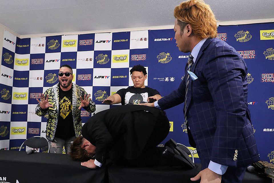 この日、タイトルマッチへ向けた会見が行われたものの、挑戦者組はKAIが「何かよ、SNSで安い土下座してたけど、俺らはよ、直接この目で土下座をみねえとな、正式決定はしねえぞ」と直接土下座を要求し、菊田も「俺ら挑戦受けねえぞ。いいのか? 全日本プロレスファンが菊田円のケツをみたいって言ってんだよ」と脅しをかけた。