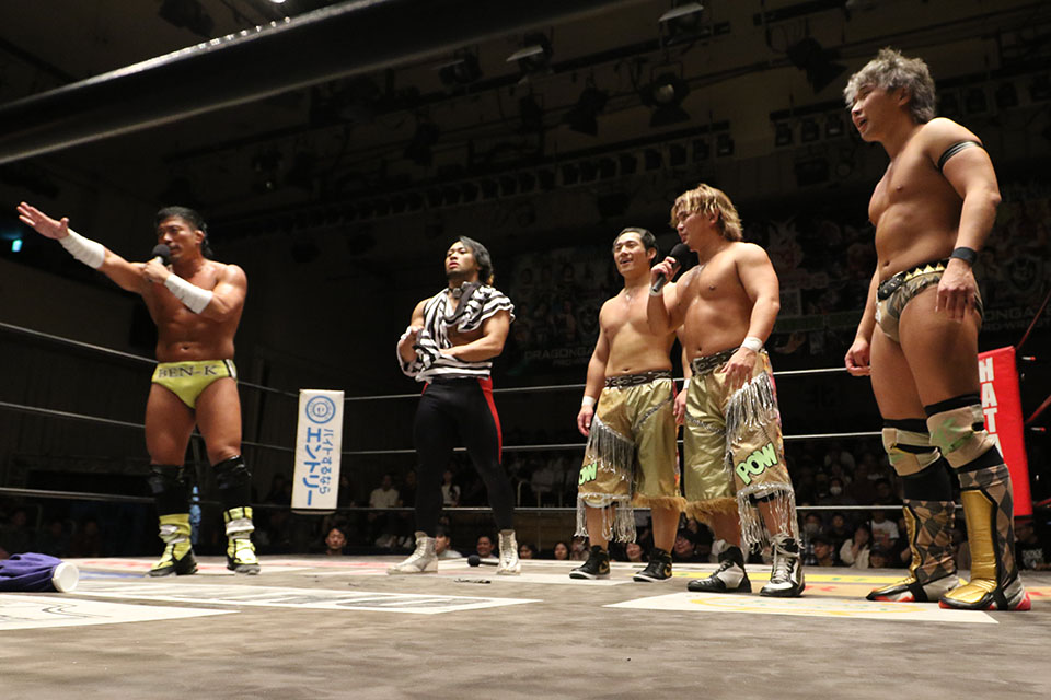 改名を諦めきれないBen-Kにとってはまたとない展開。「おい、ウソだろ? 諦めなければ夢は叶います。よくぞ言ってくれた、Riiita。これでこそ最高にイカしたおチビさんだ、ありがとう」と喜びをあらわに。ようやく箕浦がいることに気づいたBen-Kは「おう、箕浦。久々だな。まあ、元気そうで。今日から俺たちはLOVE&PEACEとしてこのDRAGONGATEの先頭を走っていくぞ。さっそくだがな、貴様らの持っているベルト、俺たちが確実に奪い取ってやるよ」とツインゲートを保持する元盟友に宣戦布告した。