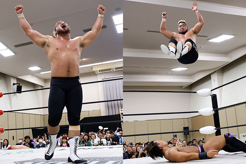 遠藤の猛攻を受けて守勢を強いられても、地元のファンから歓声が幾度となく飛ぶと、その思いに応える。コーナーに上がった遠藤に掴みかかると、「諦めろ!」とエルボーで何度も突き落とされそうになっても雪崩式バックフリップを意地になって敢行した。