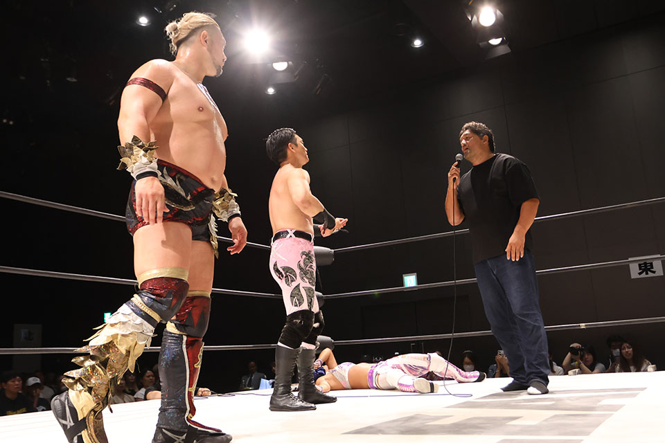 Evolutionの石川修司が来場して、T-Hawk率いるTRIPLE LOVE HAWKに宣戦布告。T-Hawkも喧嘩を買って、7・24新宿大会での全面対決が決定的となった。
