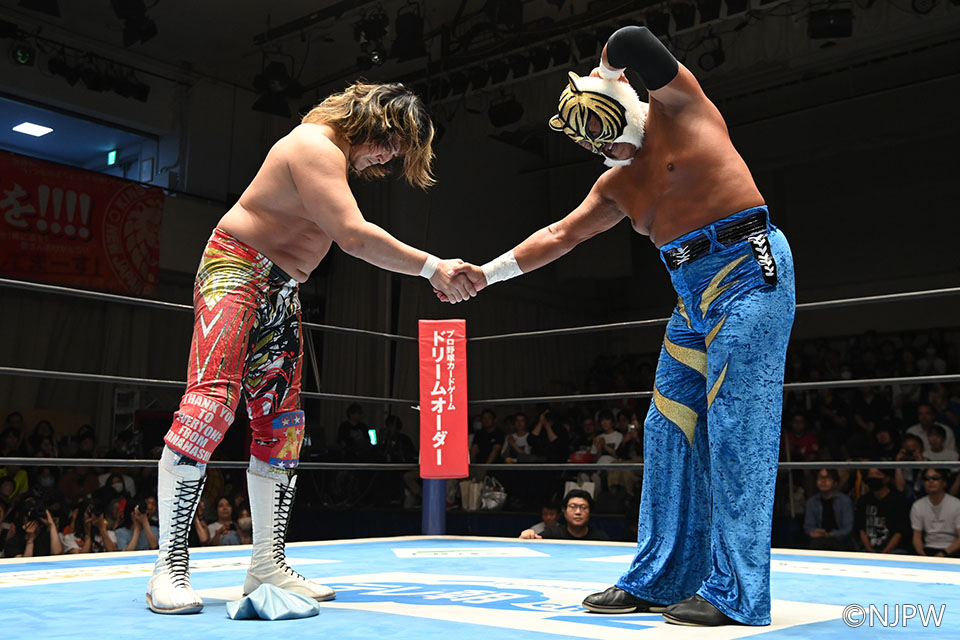 守勢に回った棚橋だったが、起死回生のスリングブレイドをさく裂。ツイスト&シャウトを挟んで再びスリングブレイドを決め、ドラゴン張り手をお見舞い。3発目のスリングブレイドでタイガーをなぎ倒すと、ハイフライフローを発射して3カウントを奪った。