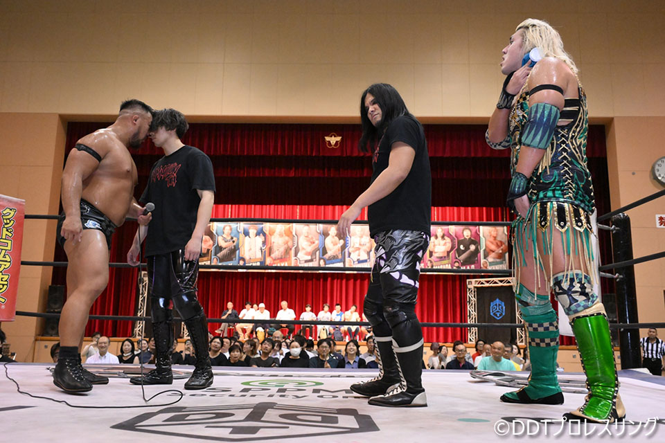 また、バックステージで飯野が「お前いいもん持ってるな。3人まとめて俺ら2人でやってやるよ」と佐々木&岡谷&イルシオンの持つKO-D6人タッグへの挑戦を要求。佐々木が「3人いないと挑戦は認めませーん」と拒むと、飯野はたまたま通りかかった須見和馬をパートナーに指名。8・9横浜大会での挑戦が正式決定した。