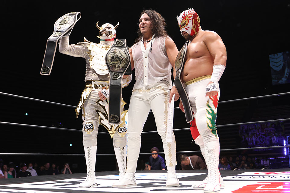 NOAHのGHCジュニアタッグ王者・ベイン&ウルフは8・5後楽園大会で王者・フラミータ&マンテを撃破し、クレイジーと組んでのトライアングル王座挑戦を表明。この日、メキシカン対決によるトライアングル戦がメキシコ恒例の3本勝負で実現した。
