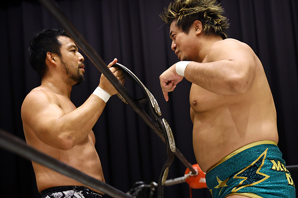 今宵も圧巻の肉弾ファイトで、KENTA眼前で完璧な3カウント。マイクを握ったYoshikiは「ミスターKENTA! センキュー・フォ・トゥナイト! ユーの持つそのGHCヘビーウェイトのベルト、ハコブネ・シップのキャプテンになるべくこのリングにカムバックしたYoshiki Inamuraがチャレンジする日を、エブリデイ、楽しみにしています! ピュアでフェア&スクウェア…正々堂々としたファイトをミーはユーとしたい!」と相変わらずクセ全開な英語混じり口調で通告した。