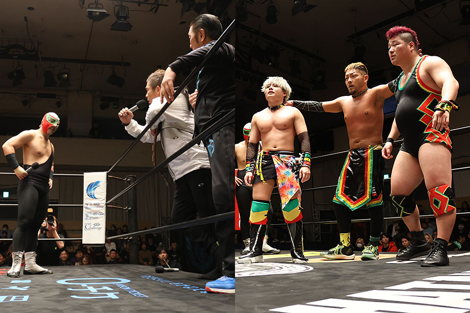 早くもタイトル戦2つが決定的になると、Kzyは「ユニットに入ったんだから夢見ようぜ。すぐにチャンスを掴んで、結果を出していこうぜ。お前らを一人前にするのが俺たちの役目だからな」と若い2人を激励し、試練として締めのマイクを任せる。GuCが「生まれ変わったこのGuCと@KEYが、Kzyさんと一緒にトライアングルゲートのベルトを巻いて、来月ここに帰ってきたいと思います!」と誓いを立てると、@KEYは「皆さん、その時はここ後楽園に来てくれますか!」と連呼。上手く締められず、Kzyたちがずっこける場面もあったものの、最後はGuCが「3月3日、ここ後楽園ホールでお会いしましょう。今日はありがとうございました!」と明るく締めくくった。