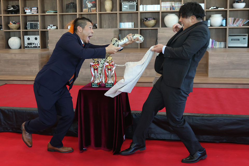 関札も「絶対に! 持ち込みません」と口をそろえていたが、会見後の写真撮影時、持参したヘビを持ち出した。爬虫類レスラーの面目躍如となったが、これに過剰な反応を見せたのがMUSASHI。関札が「俺は元祖・爬虫類レスラーなんだよ。爬虫類レスラーの正々堂々はこれなんだ!」とヘビを向けて迫ると、MUSASHIは「やめろよ、危ない! 触れた! ヘビ触れた! 噛んだらどうするんだよ?」と完全に錯乱状態。ともに決勝に勝ち進めば関札&さくだと当たることになるが、思わぬ弱点を露呈した形となった。