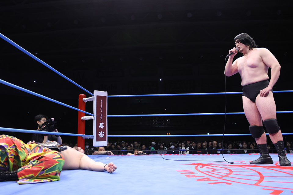 立花がトペコンヒーロを放って王者の存在感を示すと、スピアーで田村をなぎ倒す。えびす落としは不発に終わってもワンツーエルボーを乱打。田村もショートレンジラリアットで応戦し、立花がエルボーを連発してもラリアットで返り討ち。パワーボムで豪快に叩きつけて3カウントを奪った。
