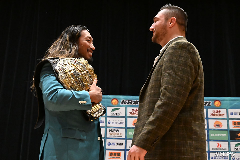 NEW JAPAN CUP史上最年少覇者・ニューマンが王者・辻に挑むIWGPヘビー戦が翌日に迫ったこの日、両者が公開調印式に臨んだ。