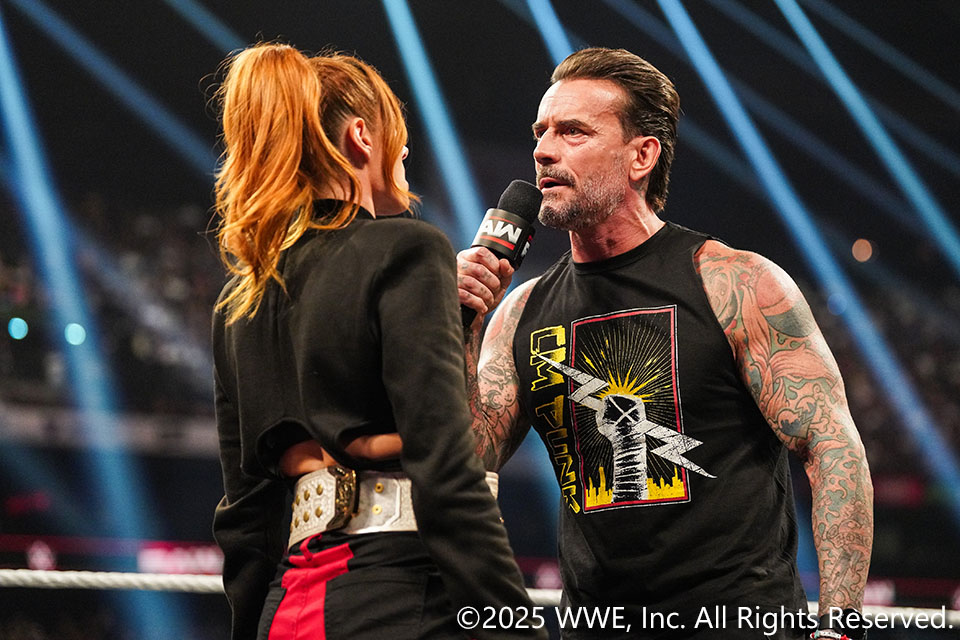すると場内にロリンズのテーマ曲が流れたが、現れたのはベッキー。「このザ・マン(漢)と話そうや」と迫ると、場内はパンク夫人で元レスラーのAJリーの名前を叫ぶチャントの大合唱となった。「そのマヌケはWWEにいないよ」と言い放ったベッキーに、パンクは「お前と話す気はない。電話してセスのクソ野郎を呼び出せ」と要求した。