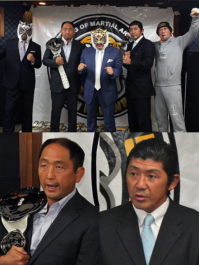 リアルジャパンが2日、東京・興義館でが記者会見を行い、6・29『LEGEND OF THE GOLD VII』後楽園ホール大会の一部対戦カードを発表。レジェンド選手権試合「(王者)大谷晋二郎vs船木誠勝(挑戦者)」、シングルマッチ「スーパー・タイガーvsロッキー川村」の2試合が決定した。初代タイガーマスクと4選手が記者会見に出席し、試合に向けての意気込みを語った。