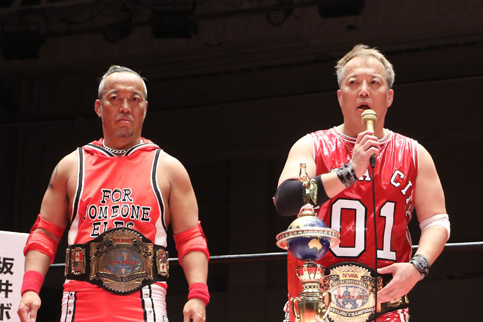 「太嘉文&松永が持ってた時、誰も挑戦表明しなかったのに、俺たちが取った途端に何でこぞって来るんだよ。ナメられてんじゃねぇか」とぼやいたヤスだったが、「俺たち48歳、まだまだ進化します」と宣言。「この年で夢を見ちゃいけないって誰が決めた? 夢を実現してはいけないって誰が決めた? だから俺たちはタッグとしてもっともっと知名度上げて、全国走り回ってやるからな」と誓ってみせた。