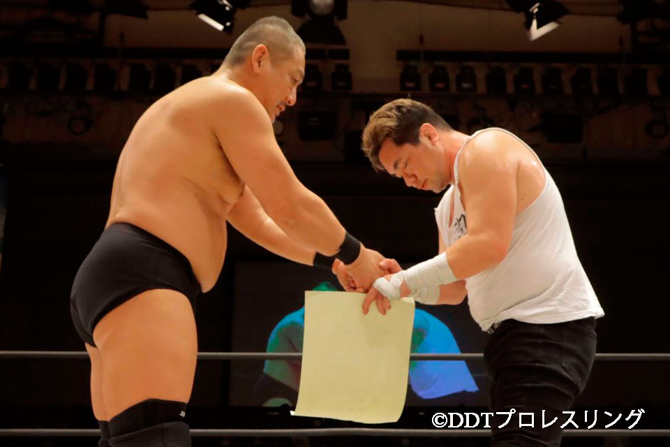 一方、高木は「俺がお前の人生摘んだみたいじゃねぇか。違うだろ。こんな仲間たちできないだろう。俺たち、もうDDTとかCyberFightとか関係ないよ。お前はかわいい後輩であり、何かあったら一緒にやろうよ。戦おうよ」とエール。「卒業おめでとう」と卒業証書を授与した。