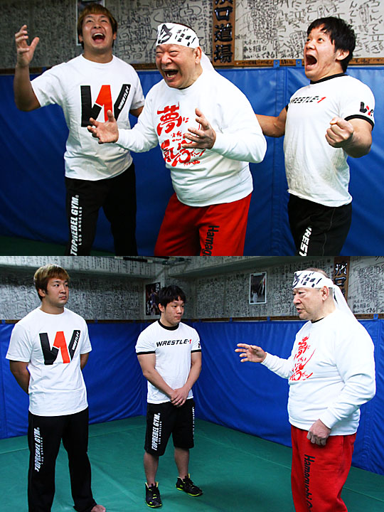 1・11後楽園大会のメインイベントでWRESTLE-1タッグ王座に挑戦(王者組はカズ・ハヤシ&近藤修司)する中之上靖文&児玉裕輔が8日、東京・浅草のアニマル浜口トレーニングジムを表敬訪問。アニマル浜口会長から多くのアドバイスを受けた二人は「気合」10連発などの絶叫で気合を注入。二人のチーム名を“中玉(なかたま)"と命名した浜口会長は「中之上が喜怒哀楽を出せるか。それがテーマ。燃えたぎる中之上をみせてくれ」と愛弟子に注文をつけた。 ◇ 中之上&児玉のW-1タッグ王座挑戦がいよいよ2日後と迫った。ともにコンディションは万全。精神面でも充実を図るべく二人はこの日、東京・浅草にある浜口ジムを表敬訪問。同ジム出身の中之上にとっては原点回帰を図る意味もあった。 二人が浜口ジムを訪れると、浜口会長が満面の笑顔で歓迎。23年間のキャリアを通じての経験から「相手、お客さんを満足させる基本があればいい。そしたらレスラーにもファンにもなめられない。これが大切」、「勝とうが負けようが最高の試合をみせる。そしたら次につながるんだよ」などのアドバイスを送った。 二人にチャンスをつかんでもらいたいとの思いから浜口会長の熱っぽい助言は続いた。児玉が剣道経験者と聞くと、「面構えが凄いんだよね。棒か何かを持ってリングに上がればいい。面をかぶってリングに上がるとか」と提案。「W-1で生きていこうと思ったら、他と違う一人にならないと。中之上もそう。11日のタイトルマッチはイメージチェンジできるチャンスなんだよ。自分を毎日新しくするんだ」と個性を確立するよう二人に求めた。 特に中之上はかわいい愛弟子とあって期待は大きい。浜口ジムといえば「気合」の2文字が代名詞で、出身選手は小島聡、大谷晋二郎らを代表格に感情豊かな選手が多い。そんな先輩たちと比較すると、中之上は温和な性格もあってかおとなしい印象を受ける。浜口会長も「問題は中之上が喜怒哀楽を出せるか。それが今回のテーマ」と指摘。「燃えたぎる中之上をみせてくれ」と注文をつけ、「怒る気持ちを前面に出したら勝てる!」と背中を押した。 その後も浜口会長は「試合前に息上げで体を動かして、大声出して万全でリングに上がる。目ん玉ひん剥いて一点をみつめるんだよ。嫌でも集中できるから」と試合に臨む心構えを説き、レスリング技術も手ほどき。二人のチーム名を“中玉"と命名し、最後に「気合」、「ベルト」、「最高な試合」、「中玉」10連発を中之上&児玉とともに絶叫し、二人に気合を注入した。 1時間を超える浜口会長からのアドバイスを受け、二人も本番2日前に気合を入れ直すことができた。「浜口ジムは僕の原点。浜口ジムがあったからプロレスラーになれて、こうやってチャンスもできた。緊張してモヤモヤしてたものが全部取れた。11日は最高の状態で上がれると思います」と吹っ切れた中之上は、「カズ・ハヤシ、近藤修司、覚悟しとけよ! 絶対勝つ!!」と宣言。児玉も「気負いすぎてるかなという部分があったけど、吹っ切れてすっきりしました」と口を揃え、「最高のタイトルマッチをメインでやってやる。待ってろ!」と気勢を上げた。 実績に乏しい中之上&児玉のタッグ王座挑戦に否定的な声があるのは確か。気合を注入された二人はそれを本番で覆すのみだ。