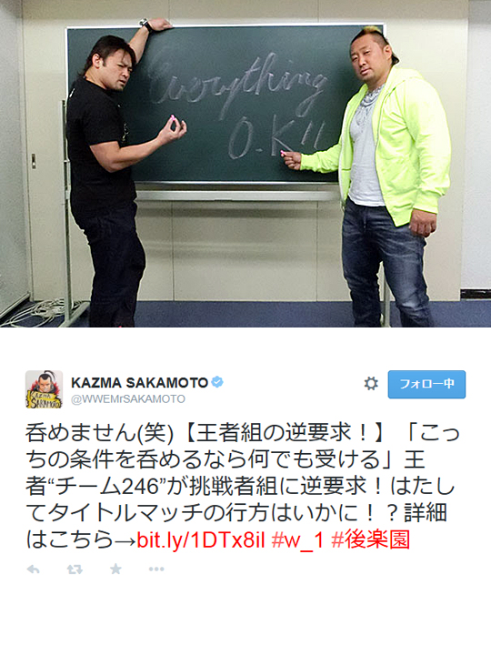 最後に近藤が「だからルールをのむためのこっちの条件としては、KAZMAがツイッター・アカウントを削除して、さらに“SAKAMOTO安易"に改名する。それが出来るならどんなルールでも受けてやる」とまとめたが、元WWE戦士なだけに2万人以上のフォロワーを有するSAKAMOTOは、早速自身のアカウント上(@WWEMrSAKAMOTO)で「のめません(笑)」と拒否。着地点の見えない論戦(?)は、果たして何を生み出すのか…。