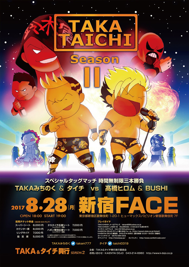TAKAタイチ興行が約8カ月ぶりに開催されることになった。8月28日に東京・新宿FACEで『TAKA&タイチ興行 SEASON2』として開催される。ロス・インゴベルナブレス・デ・ハポンから高橋ヒロム&BUSHI組が参戦し、TAKAみちのく&タイチ組とスペシャルタッグマッチで対決する。