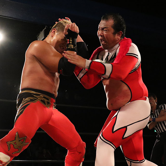 アキラーコールの中、試合になると、アキラーの乳首が露出し、鼓太郎も思わず笑ってしまう。それでもヘッドロックで絞め上げ、アキラーがロープに飛ばそうとしても角をつかんで阻止。ショルダータックルで突っ込んだが、倒れないアキラーもショルダータックルで応戦。鼓太郎のエルボーをかいくぐってライガーばりの掌打を打ち込み、筋肉ポーズを決めた。