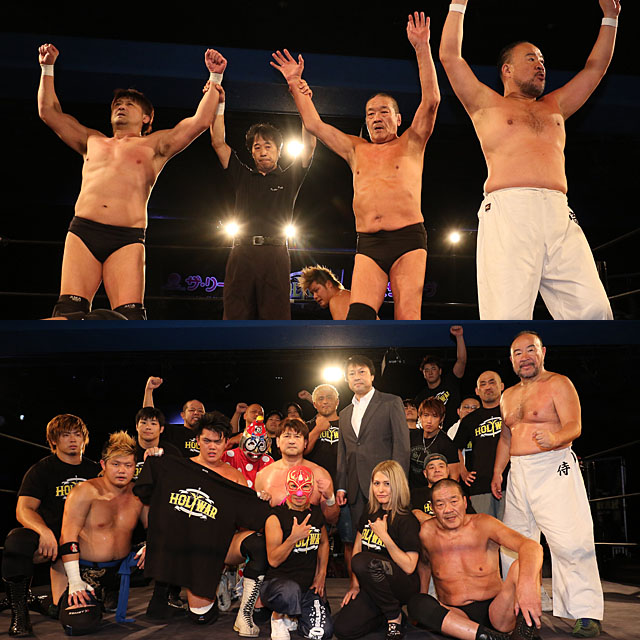 『川田利明プロデュース「Holy War〜vol.3〜」』 東京・新宿FACE(2018年10月1日) ○大森隆男&越中詩郎&藤原喜明vs橋本大地&清宮海斗&杉浦透× 初参戦の大地が清宮&杉浦とともに奮闘したものの、越中&藤原&大森がそれを上回る大暴れを披露。最後は大森が杉浦をアックスボンバーで仕留めて世代闘争を制した。 川田プロデュース興行のテーマは「ベテランvs若手」。メインイベントは文字通りの世代闘争となった。ベテラン軍はレギュラー参戦している越中&藤原に全日本の大森を加えた3人。対する若手は3大会連続のメイン出場となるノア・清宮、FREEDOMS期待の若手・杉浦に、大日本の大地を加えたトリオなった。大地は川田興行初参戦。大地の父・橋本真也と川田はライバル関係だったが、意外にも川田は「近くで大地の試合を見るのは初めて」だという。 まずは杉浦と越中が気合い全開の肉弾戦で場内を沸かすと、大地が登場。藤原と対峙した。強烈なビンタを繰り出した藤原に対し、大地も真っ向からビンタをお見舞い。打ち返されても、ミドルキックを土手っ腹に叩き込む。しかし、藤原も脇固めで逆転。しつこく絞め上げて大地を苦しめた。 大地の背中を叩いて清宮がリングに入ると、藤原相手に果敢に前に出るが、アームロックに捕まって悲鳴をあげる。ベテラン軍はチャンスを逃さず、越中がヒップバットを乱射すると、かつてWJで共闘した大森とダブルショルダータックルをズバリ。再び入った藤原がクロックヘッドシザースで絞め上げると、場外乱闘でもベテラントリオがリードした。 だが、若い3人も引かない。総出で大森をいたぶると、杉浦は場外で藤原と真っ向からやり合った。清宮はリング中央で大森をスリーパーに捕獲。その清宮を藤原がスリーパーで引き離すが、大地が蹴り飛ばしてカットイン。控えに回った選手も怒号をあげ、戦いは白熱していく。タッチをもらった大地は「オッサン、どうした!?」と大森を挑発。重たいミドルキックを乱射する。だが、受け止めた大森はバックドロップでぶん投げて劣勢を脱出し、越中にタッチを渡した。 ジャンピングヒップアタックをこれでもかと乱射した越中は、場外に転落した大地にエプロンやテーブル席の上からヒップアタックを発射する。だが、大地もブレーンバスターでキッチリとお返しした。代わった清宮も藤原の頭突きを受け止めた上で、串刺しジャンピングエルボー、ミサイルキックとラッシュ。代わった大森がフロントハイキック、ニールキックと畳みかけても、アックスボンバーはカウンターのドロップキックで阻止する。 杉浦にタッチが渡ると、若手トリオは大森に連続串刺し攻撃を発射。杉浦は清宮たちに分断するよう促すと、大森には反転式のダイビングボディアタックを見舞う。さらに、スカイツイスタープレスに行くが、大森に避けられて痛恨の自爆に。 ここがチャンスと、大森は張り手やエルボースマッシュを発射。抵抗する杉浦をフルネルソンバスターでぶん投げる。越中がダイビングヒップアタックを放つと、藤原も頭突きでアシスト。すかさず大森がアックスボンバーを叩き込んで、粘る杉浦を仕留めた。 激闘の余韻がリングを包み込む中、川田プロデューサーの他、全出場選手がリングに集結する。マイクを持った川田は「本日は最後までありがとうございました。そして、選手の皆さん、お疲れ様でした。また次回なんですけど、できれば今年中にもう1回。それが間に合わないにしても来年早々行いたいと思いますんで、また会場に来てください」と次回大会開催に意欲を見せる。藤原が「東京ドームじゃダメか?」と詰め寄ると、苦笑しつつ「組長、階段を踏んでいきましょうよ。今日はありがとうございました」と締めくくり、出場全選手で記念撮影を行った。 試合後、改めて大会の総括を行った川田は、初参戦の大地を「もう少しスケールの小さい人かなと自分の中では思っていたけど、身体も大きくなっていたし。お父さん譲りの蹴りとはまた違うキレイな蹴りをやってましたよね。まだ若いんですよね? もっともっと伸びると思う」と評価。今回はベテランの勢いが若い選手たちを飲み込む結末となったが、「段々と若手の選手とベテラン組というコンセプトが、3回目にしてみんなにもわかってもらえてきたかなというのがある」と手応えを感じつつ、「どっちかと言ったら、若手というだけじゃなく、見た目のカッコいい系の選手に出てほしいなと思っているんで。だから、そういう選手たちにベテラン組がどうジェラシーを感じて、いじめるのかっていうところも、もしそういうのがあれば面白いんじゃないかなと思っている」と更なる激闘に期待を示した。 【川田の話】 ――初めての新宿FACEだったが? ▼川田「ただ、月曜日だから。これだけ月曜日のわりには来てくれたかなと。今年中にできればもう1回ぐらいやりたいなと思っているので。段々若手の選手とベテラン組というコンセプトが、3回目にしてみん