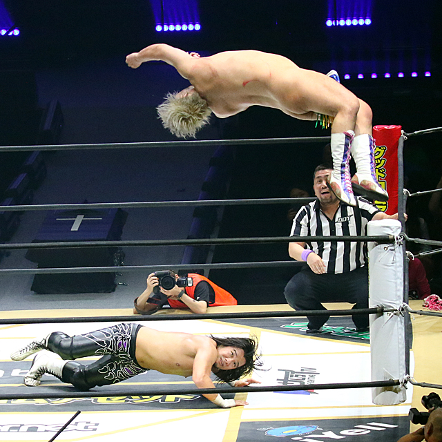 その後もディーノの“男色的見せ場"は続く。佐々木のダイビングエルボードロップ自爆を誘って、股間をまさぐりまくり、佐々木のダイブ攻撃も空中キャッチ式のリップロック(ディープキス)で迎撃。譲らない佐々木もディーノを場外に追いやり、捨て身の場外ダイビングエルボードロップを敢行して場内をどよめかせたが、ならばとディーノもテーブルクラッシュ式のパイルドライバーで応戦し、そのままレフェリー3人を次々にリップロックで失神に追い込む“暴走状態"に突入した。
