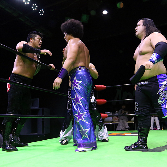王者の火野裕士不在のまま続く前哨戦戦線。この日も6人タッグマッチで王者・マイバッハと激突した50FPは、フーリガンズのラフをしのぎつつ、真っ向から火花を散らした。最後はトリオを組んだ齋藤が、相手方のコーディを撃沈。これでマイバッハ相手の前哨戦を4連勝とした。