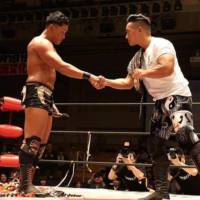ベルトを肩にかけた王者はリング上で稲葉と向かい合うと、「稲葉さん。僕は今、あなたの試合を見て、あなたの覚悟を感じました。優勝、おめでとうございます」と素直に優勝を称え、「今の試合を見て、俺もウズウズしてんだ。今月18日、新木場で試合があるでしょ? そこで前哨戦を組んでもらいましょう。そして俺は9月1日、横浜文体のメインであなたを待ってます。よろしくお願いします」と言い放って去っていく。
