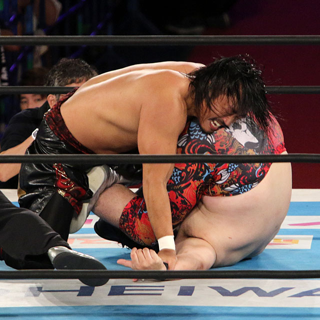 ゴング直後、コーナーに上がって歓声を煽った矢野は、同じ動きを後藤に要求。仕方なく後藤はコーナーに上がって声援に応えてリングに降りるが、矢野は背後からにじり寄り、自分のTシャツで顔を覆うと、そのままスクールボーイで丸め込んだ。あわや3カウントの展開に場内はどよめく。