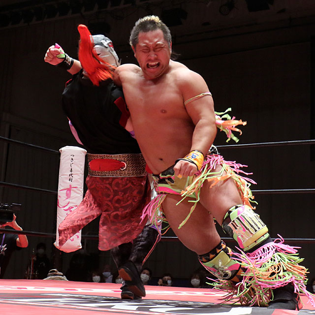 一方的な展開が続いたが、SUGIはショルダースルーを狙われたところでエプロンに不時着し、ダイブ式飛びつきフランケンやトップロープ上での619、ライオンサルトと猛攻。たまらず近藤が場外に転落すると、ヒザのダメージを気にせずケブラーダで宙を舞った。リングに戻ると、近藤がザ☆オリジナル、ランラルセと得意技を連発して立て直しを図るが、SUGIはその場飛びスパニッシュフライをズバリ。スワンダイブ式フランケンをキャッチされても、豪快な前方回転エビ固めで切り返し、ロープの上をダッシュしての串刺しドロップキック、450°スプラッシュと一気呵成に攻め立てた。