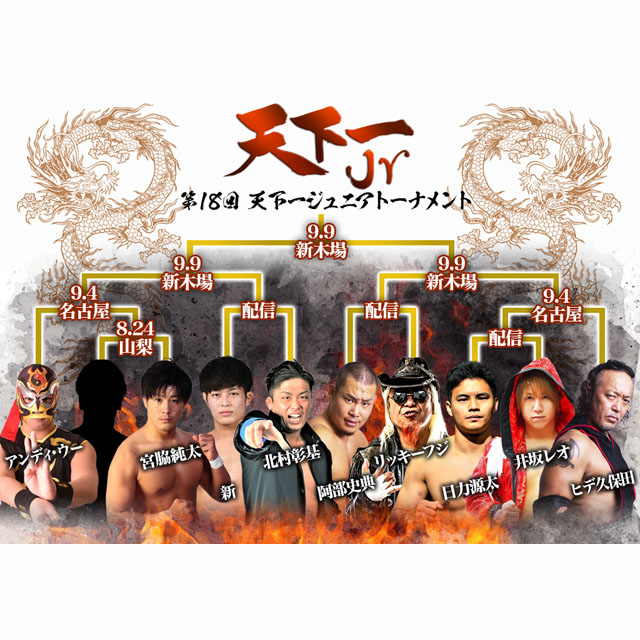他の1回戦の組み合わせは「北村vs新」、「阿部史典vsリッキー」、「日力源太vs井坂レオ」に決定。この3試合は後日配信となる。9・4名古屋大会で2回戦、9・9新木場大会で準決勝、決勝戦がそれぞれ行われ、優勝者が決まる。詳細は以下の通り。