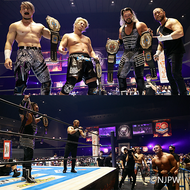 EVIL&裕二郎&SHOのHOUSE OF TORTURE(拷問の館)トリオが、棚橋&タマ&ロアの挑戦を無法連係で退け、NEVER6人タッグ王座3度目の防衛に成功した。