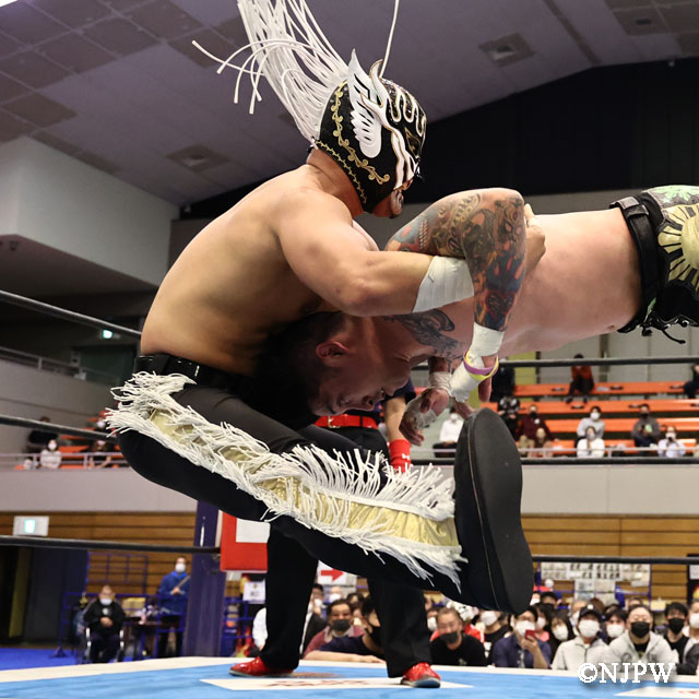 『BEST OF THE SUPER Jr.29』青森・八戸市東体育館(2022年5月19日) Bブロック公式戦 ○エル・デスペラードvsTJP× デスペラードが苦闘の末にTJPを撃破して開幕2連勝。「楽しかったろ? 凄かったろ? 強かったろ? これがスーパージュニアだ」と胸を張り、「俺が全大会締めてやるぜ」と主役獲りを宣言した。 スーパージュニア初優勝を狙うデスペラードは初戦でティタンを撃破。5・25後楽園大会で実現する相思相愛のリンダマン戦へ向けて「最高の刺激でお出迎え」を予告していたが、この日の2戦目で難敵が立ちはだかった。元WWEクルーザー級王者で、初戦でワトを破ったベテランTJPだ。 場外戦で優位に立ったTJPはデスペラードをして「首バリバリバリっていって、そのあと右半身全部しびれたぞ。おっかねえ」と言わしめた顔面ウォッシュなどで攻勢に出た。デスペラードはドラゴンスクリュー、マフラーホールドと足攻めで応戦したが、トップロープに乗せられるとコーナー最上段からのダイビングボディプレスを被弾して失速。フロッグスプラッシュ、側頭部へのローリングソバットの波状攻撃に出たTJPは、デスペラードがピンチェロコを狙っても卍固めで切り返した。 苦もんしたデスペラードだったが、ピノイストレッチを首固めで切り返して難を逃れた。ヌメロ・ドスで絞め上げ、耐えたTJPがカナディアンデストロイヤーを仕掛けても、デュードバスターでグサリ。ピンチェ・ロコをウラカンラナで切り返され、ハイキックを食らっても、ロコモノで返り討ち。粘るTJPにピンチェ・ロコを爆発させて3カウントを奪った。 デスペラードがTJPに苦しめられながらも最後は快勝。開幕2連勝を飾った。「強いね、やっぱりTJP。凄いよ」と認めたデスペラードはリンダマンの「Bブロックは地味」発言を持ち出して「実際、俺もやるまでは俺も含め地味なヤツしかいねぇなって正直思ってた。でも来てみたら楽しかったろ? 凄かったろ? 強かったろ? これがスーパージュニアだ」と豪語。「この派手でも地味でも強くて凄くてカッコいいヤツら全部倒して俺が優勝する」と八戸のファンに誓って締めた。 3戦目は5・22秋田大会のウィーラー・ユウタ戦。この日のDOUKI戦でのユウタの戦いぶりを目にして「正直よ、モクスリーに血まみれにされて、それで持ち上げられただけのヤングライオンに毛が生えた程度かなと思ってたけど、なかなかどうしてやるじゃないか。思ってたよりはお前が楽しみだよ」と評価したデスペラードは「この後メインがいくつあったかな? もう数えんのも嫌で忘れちまったけどよ。俺が全大会締めてやるぜ」と高らかにスーパージュニアの主役獲りを宣言してみせた。 【デスペラードの話】「いってぇ。顔面ウォッシュってあんな遺ぇのな。首バリバリバリっていって、そのあと右半身全部しびれたぞ。おっかねえ。あれは禁止すべきだな。もう俺じゃないから、禁止じゃなくていいや。俺じゃないヤツが食らうんだから。俺の時は使うな。もうリングの上で言っただろ。これ以上、何言おうとしたって残りカスのどうしようもない言葉しか出てこないよ。えーと、何だっけ? 次? そう、次だ。次、秋田だよな? 俺たちは。ウィーラー・ユウタ。DOUKI相手にあれだけの…最後、ホルヘスペシャル取り合いやって、自分の名前つけたシートベルトなんとかに持ってったのは、ただ、チヤホヤもてはやされてるだけじゃないんだなって感想を持ったよ。正直よ、モクスリーに血まみれにされて、それで持ち上げられただけのヤングライオンに毛が生えた程度かなと思ってたけど、なかなかどうしてやるじゃないか。思ってたよりはお前が楽しみだよ。この後メインがいくつあったかな? もう数えんのも嫌で忘れちまったけどよ。俺が全大会締めてやるぜ」 【試合後のTJP、アキラ】 ▼TJP「(※UNITED EMPIREのタオルを被ってアキラと共にバックステージに現れ、怪しげに笑いながら)デスピー…デスピー…味見させてくれてありがとう。これでお前のタイミング(ペース)が分かった。次回は必ず仕留める。この試合に負けたからといって大したことはない。お前なんか全然怖くもない。お前はマスクとフェイスペイントで素顔を隠してる。でも、内側に秘められた俺はマスクで覆われたお前なんかより何倍も怖いんだよ。俺はお前の本性を知っているし、お前がどこから来たかも知っている。今日でお前の戦い方は分かったから、次からは誰よりも上手くお前とやり合える。スーパージュニアはまだ始まったばかりだ。俺は2点獲っている。最後に制するのはUNITED EMPIREだ。だが、俺たちが欲しいのはトロフィー以上のものだ。俺が優勝しても、アキラが優勝しても、それはUNITED EMPIREチーム全体の優勝だ。ウィル、コブ、オーカーン、ヘナーレ、オージーオープン、メンバーの勝利はUNITED EMPIREというチーム全体の勝利に等しい!」 ▼アキラ「その通りだ」 ▼TJP「俺たちが見てるのはトロフィー以上のものだ。それはIWGPジュニアタッグのベルトという宝