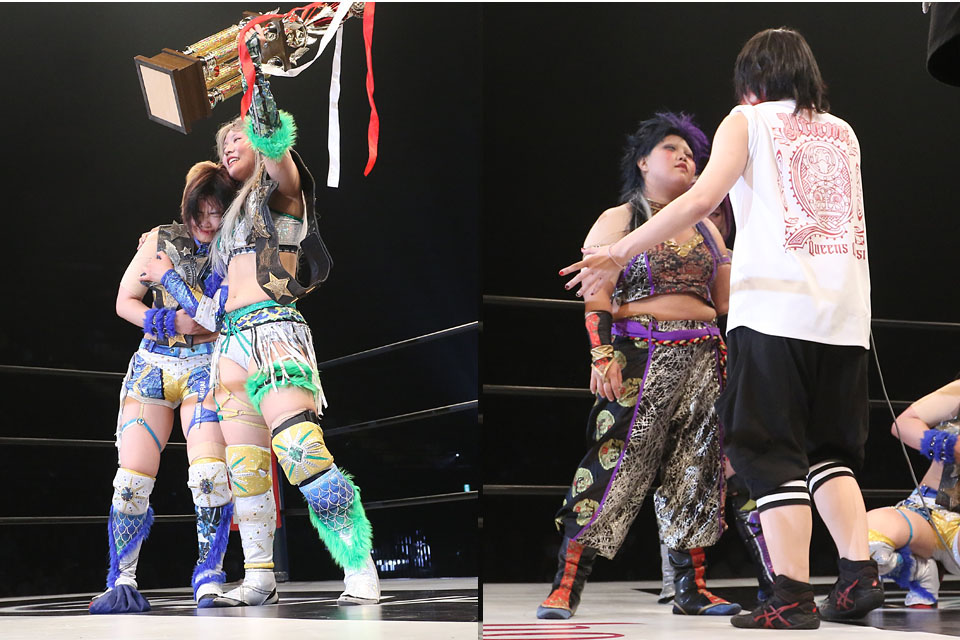 MIRAI&壮麗がゴッデス王座死守。試合が決したあと、林下詩美や上谷沙弥らQueen's Questのメンバーがリングを占拠した。詩美は「お前らに用はない」とMIRAI&壮麗を下がらせると、大江戸隊の面々と向かい合う。両ユニットは以前から因縁を引きずる関係にあったが、詩美は「おいおい、試合前にTwitterでもあんなに言っておいて、負けてじゃん。どうしたの? そんな弱かったっけ。そんな口だけだったっけ」と刀羅たちを糾弾した。