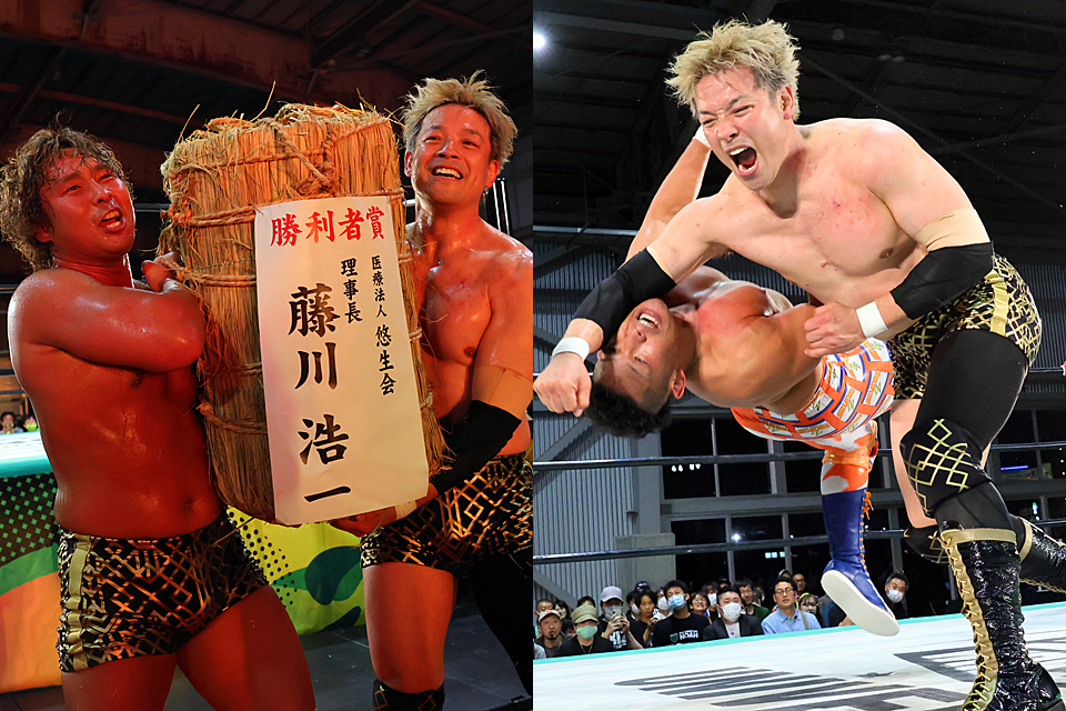 序盤から息のあったコンビネーションと、怒とうのチョップ&キックで稲葉に猛攻。終盤には清宮の援護を受けた稲葉もジャーマンで潮崎を投げまくって猛反撃に出たものの、最後は潮崎がゴーフラッシャー、豪腕ハンマー乱打からの豪腕ラリアットで仕留めてみせた。