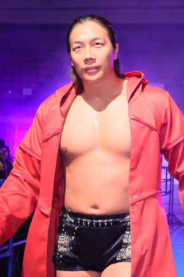 ラリアットでジェリコに先制を許したTAKESHITAはドン・キャリス・ファミリーのボス、ドン・キャリスに張り手で叱咤されて奮起。ジェリコをバリケードに投げつけ、場外で容赦なく垂直落下式ブレーンバスターで突き刺す。さらにフライングラリアット、ジャンピングニーと攻め込んだ。