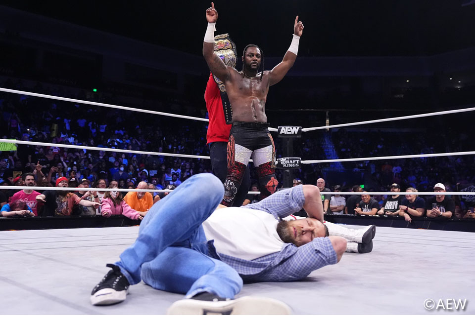 ストリックランドが去ったかに思われたが、さらなる仕掛けを用意していた。ダニエルソンがユウタを介抱していると、リングに引き返して、ハウスコールキックをさく裂。不意打ちを食らったダニエルソンが大の字となった中、ストリックランドはAEW世界王座のベルトを掲げて勝ち誇った。