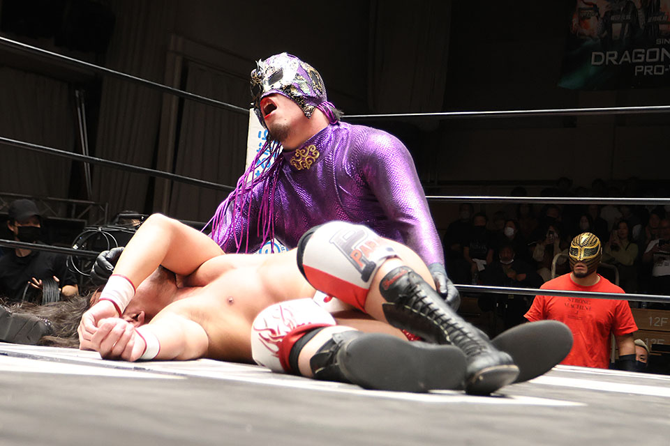 次期挑戦者のマシーン・Jがリングサイドで見守る中、試合はスタート。アグレッシブに仕掛けたYAMATOだったが、先にペースを握ったのはシュンだった。エプロンにYAMATOを追いやると、強烈な二段蹴りで場外に蹴落とす。場外戦ではパイプイスで腰を痛打。一方的に暴行し、「これがドリームゲート王者か? 笑わせんじゃねえよ」とせせら笑う。その後もシュンペースが続き、大の字になったYAMATOの前で無言のまま仁王立ちすると、突然、高笑いを決めた。