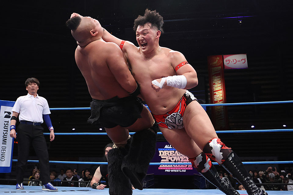 『ドリームパワーシリーズ2025』大田区総合体育館(2025年3月29日) ○菊田円&芦野祥太郎&本田竜輝&ザイオンvs斉藤レイ&鈴木秀樹&綾部蓮&羆嵐× DRAGONGATEの菊田がチャンピオン・カーニバル前哨戦で羆嵐を粉砕。「俺がコテンパンにやってやるよ」と同ブロックの本田に照準を絞った。 カーニバル初出場となる菊田はドラゲーが誇る大型選手。この日、全日本初参戦を果たし、芦野&本田&新外国人・ザイオンと組んで、レイ&鈴木&綾部&羆嵐と激突する前哨戦に臨んだ。 序盤から菊田は本田とのコンビネーションが機能せず、味方同士でにらみ合う始末。ツープラトン攻撃も不発に終わり、菊田は本田にヒップアタックを見舞った。それでも菊田は綾部相手に逆水平とエルボーのラリーを展開。ランニングヒップアタックを放った。綾部がフルネルソンバスターでやり返しても、菊田の勢いは止まらず。最後はジャンピングヒップアタック、ラリアット、ローリングラリアットとたたみかけて羆嵐から3カウントを奪った。 菊田がカーニバル前哨戦で存在感を発揮したうえで快勝。試合後は本田と再びにらみ合った。「あの8人いて最後勝ったのは、DRAGONGATEの菊田円だ。みんな見ただろ? 見ただろ? 菊田が勝ったんだ。このままチャンピオン・カーニバル全勝優勝してやるよ」と吠えた菊田は「赤髪のヤツいたな。あいつ、全然息合わねえしよ。息合うわけねえんだよ。見た目一緒でもな、こっちはクルックルのかわいいかわいい髪の毛なんだよ。お前みたいな赤色に染めて、ちょっと強くなった気分のヤツには負けねえんだよ、バカヤロー」と本田を意識。「俺がコテンパンにやってやるよ。本田、覚悟しとけ」と予告してみせた。 【菊田の話】「全日本プロレス初登場の菊田円だ。Road to チャンピオン・カーニバルか。なんかそういう試合だったな。最後勝ったのは誰だ? あの8人いて最後勝ったのは、DRAGONGATEの菊田円だ。みんな見ただろ? 見ただろ? 菊田が勝ったんだ。このままチャンピオン・カーニバル全勝優勝してやるよ。そして、なんかこの赤色のコスチュームと似たような赤い色のコスチュームをはいた赤髪のヤツいたな。あいつ、全然息合わねえしよ。息合うわけねえんだよ。見た目一緒でもな、こっちはクルックルのかわいいかわいい髪の毛なんだよ。お前みたいな赤色に染めて、ちょっと強くなった気分のヤツには負けねえんだよ、バカヤロー。お前と当たるのはどこだ? 北海道か、知らねえけどよ。俺がコテンパンにやってやるよ。本田、覚悟しとけ」 【本田の話】「始まるな、チャンピオン・カーニバル2025。おい、今見た通り、いろんなヤツがいるよな。その中で必ず俺が優勝して、このチャンピオン・カーニバル俺がもらうぞ。そしてよ、なんだよ、おい? 味方にいた菊田円。あんまナメんじゃねえぞ。ぶっ潰すぞ」 【ザイオンの話】「初めての全日本だ。こんなに嬉しいことはないし、誇らしいこともない。日本を愛してる。本当にありがとう。ザイオンは日本にいる。突っ走ってやる」 【レイの話】「なんだ、今の試合は? 誰だ、今の組み合わせ考えたヤツ。まあ、いい。それよりも今日は兄・斉藤ジュンの三冠防衛戦がある。必ず宮原健斗をぶっ倒してくれるだろうぜ。楽しみにしてるぜ。フォー!」 【羆嵐の話】「いやいやいやいや、ちょっと座らせてくれや。チャンピオン・カーニバル最後の前哨戦、ヤバいな。全然いい形で始められなかった。DRAGONGATEの菊田、すごいな。あいつは確か別ブロックだったよな。同じブロックでも別ブロックでも、この借りは返させてもらうよ。3年ぶり3度目だよ。チャンピオン・カーニバル、やっと掴んだこのチャンスを俺は離さない。今日はそういうところだ。俺だけ見とけ。ハー!」