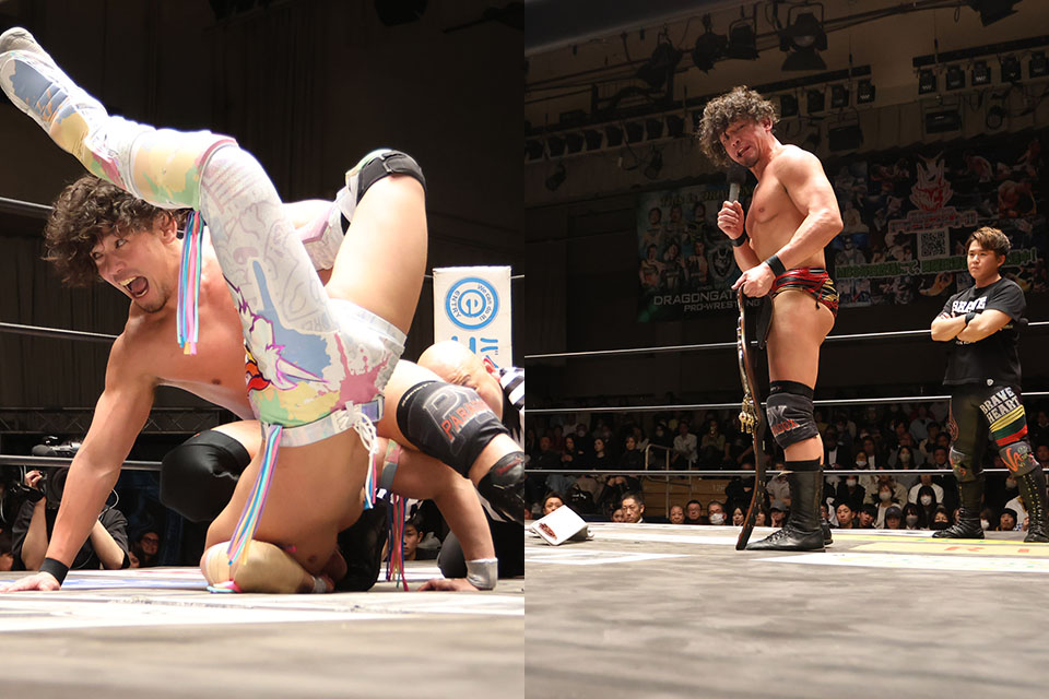 そして、「やっぱりこの2本のベルトは並び立つんじゃない。向かい合ってこそDRAGONGATEの本来あるべき姿なんだなと僕は思います。そういうことで、改めてですけどね、このブレイブゲートのベルトは封印から返上にしようと思います」とタイトル返上を表明した。
