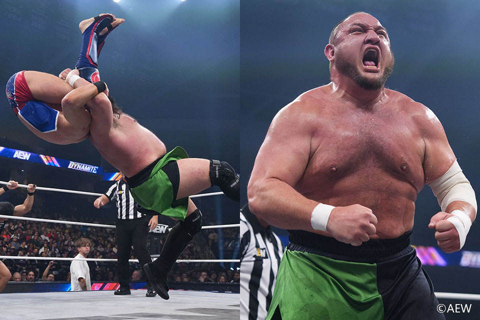 AEWダイナマイトが現地時間21日、フロリダ州オーランドで行われ、サモア・ジョーがAEWトリオ王者・マイク・ベイリーを粉砕。試合に介入してアシストした柴田勝頼は3日後の1・24コリジョンでハングマン・アダム・ペイジとの一騎打ちが決まった。 “The OPP's"ジョー&柴田&パワーハウス・ホッブスは1・17コリジョンでペイジ&ケビン・ナイト&ベイリーに敗れ、9ヵ月間も保持してきたAEW世界トリオ王座から陥落。この日、ジョーがベイリー、1・24コリジョンで柴田がペイジと一騎打ちに臨むことになった。 ジョーは打撃ラッシュでベイリーを圧倒。ベイリーも多彩な蹴り技で反撃するものの、ジョーは強烈な逆水平一発でねじ伏せる。ベイリーがスライディングキック、ケブラーダの波状攻撃で応戦すると、ここで柴田がフックとともにやってきて、二人がかりで暴行。すかさずジョーがサッカーボールキックで蹴り飛ばし、ベイリーが場外に退避しても柴田が暴行を加えてからリング内に連れ戻した。 ベイリーもミサイルキックで反撃。ソバット、カカト落とし、ミドルキック、トラースキックと蹴りの雨を降らせ、シューティングスタープレスを放った。エプロンではムーンサルトダブルニードロップを繰り出したものの自爆に終わり、柴田がエプロン、場外とブレーンバスターを連発。ニークラッシャーで痛めつけてからベイリーをリングに戻すと、ジョーも変型ニークラッシャーで追い討ちをかけ、アキレス腱固め、ヒザ十字固めで絞め上げた。 なおもジョーがローキックを連発して足攻めを展開すると、ベイリーはフロントハイキック、サッカーボールキックで意地の反撃。ムーンサルトダブルニードロップを投下すると、顔面蹴り、キリモミ式ジャンピングハイキックをぶち込む。フックの介入も阻み、スピンキックでジョーの顔面を射抜いたが、コーナーに上がったところを柴田が妨害。すかさずジョーがマッスルバスターを爆発させて3カウントを奪った。 ジョーがベイリーを撃破し、トリオ王座戦の借りを返した形。3日後には柴田がペイジとの一騎打ちを控え、これに勝利すればリマッチの可能性が浮上してくる。