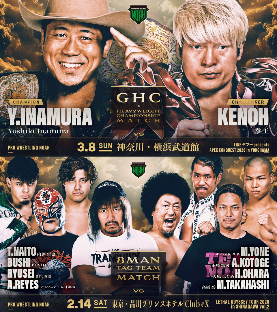NOAHは11日、2月〜3月7大会のカードを発表。3・8横浜武道館大会でのGHCヘビー級選手権試合「(王者)Yoshiki Inamura vs 拳王(挑戦者)」が正式決定したほか、内藤哲也の2・14品川(夜の部)、3・1後楽園2大会参戦などが決まった。 この日(11日)の後楽園大会で王者Yoshikiが杉浦貴の挑戦を退けて4度目の防衛に成功。試合後に拳王を指名して王座戦で合意し、TEAM 2000Xに阻まれ続けていた念願の拳王戦が横浜武道館のビッグマッチで実現することになった。 NOAH参戦に区切りをつけることを表明したガレノと清宮海斗の一騎打ちも正式決定。横浜武道館を舞台に、スペイン語で「またね」を意味する「nos vemos」と銘打たれた区切りの一戦を行う。 『LOS TRANQUILOS de JAPON』(LTJ)の内藤哲也の2・14品川(夜の部)、3・1後楽園2大会参戦も決まった。品川ではNOAH初参戦となるアンヘル・レイエス、BUSHI、RYUSEIとLTJカルテットを結成する。アンヘルはスペイン・バルセロナ出身の20歳でキャリアは2年。昨年9月にLTJ入りを果たし、この日の後楽園大会にも乱入して内藤&BUSHIの防衛を手助けしていた。 このほか2月6大会(2・14品川昼・夜、2・20広島、2・21薩摩川内、2・22熊本、2・23博多)の全カード、試合順も決定。ジュニアタッグリーグ戦と並行してGHCヘビーに向けた前哨戦が行われるほか、新人とトップ勢のシングルマッチも軒並み組まれた。品川(昼)では「清宮海斗vs鶴屋浩斗」、広島では「征矢学vs鶴屋浩斗」、薩摩川内では「マサ北宮vs小柳勇斗」、熊本では「OZAWAvs小柳勇斗」、博多では「ガレノvs高橋碧」が行われる。 発表カードは以下の通り。 【NOAH】2/14(土) 東京・品川プリンスホテル Club eX『LETHAL ODYSSEY TOUR 2026 in SHINAGAWA vol.1〜NOAH Jr. TAG LEAGUE 2026〜』12:15開場、13:00開始 ◇第1試合◇ 小柳勇斗 稲畑勝巳 Eita vs ブラックめんそーれ AMAKUSA 征矢学 ◇第2試合◇ 大原はじめ 近藤修司 谷口周平 vs HAYATA 遠藤哲哉 KENTA ◇第3試合◇ 高橋碧 晴斗希 ガレノ vs 杉浦貴 マサ北宮 OZAWA ◇第4試合◇ 鶴屋浩斗 vs 清宮海斗 ◇第5試合◇ ▼「NOAH Jr. TAG LEAGUE 2026」公式戦 Hi69 小峠篤司 (1/15) アレハンドロ ドラゴン・ベイン ◇第6試合◇ ▼「NOAH Jr. TAG LEAGUE 2026」公式戦 カイ・フジムラ アルファ・ウルフ (1/15) 政岡純 タダスケ ◇第7試合◇ 小田嶋大樹 ダガ 拳王 vs キーロン・レイシー マーク・トゥリュー Yoshiki Inamura 【NOAH】2/14(土)東京・品川プリンスホテル Club eX『LETHAL ODYSSEY TOUR 2026 in SHINAGAWA vol.2〜NOAH Jr. TAG LEAGUE 2026〜』16:45開場、17:30開始 ◇第1試合◇ 鶴屋浩斗 HAYATA 遠藤哲哉 vs 小柳勇斗 Hi69 拳王 ◇第2試合◇ 近藤修司 征矢学 vs 谷口周平 丸藤正道 ◇第3試合◇ アレハンドロ 晴斗希 清宮海斗 vs カイ・フジムラ マサ北宮 OZAWA ◇第4試合◇ 政岡純 タダスケ アルファ・ウルフ vs ドラゴン・ベイン ガレノ Yoshiki Inamura ◇第5試合◇ 高橋碧 大原はじめ 小柳勇斗 モハメド ヨネ vs アンヘル・レイエス RYUSEI BUSHI 内藤哲也 ◇第6試合◇ ▼「NOAH Jr. TAG LEAGUE 2026」公式戦 稲畑勝巳 Eita (1/15) ブラックめんそーれ AMAKUSA ◇第7試合◇ ▼「NOAH Jr. TAG LEAGUE 2026」公式戦 キーロン・レイシー マーク・トゥリュー (1/15) 小田嶋大樹 ダガ 【NOAH】2/20(金)広島産業会館東展示館『LETHAL ODYSSEY TOUR 2026〜NOAH Jr. TAG LEAGUE 2026〜』17:30開場、18:30開始 ◇第1試合◇ 鶴屋浩斗 vs 征矢学 ◇第2試合◇ 小柳勇斗 高橋碧 大原はじめ 拳王 vs HAYATA 遠藤哲哉 KENTA Yoshiki Inamura ◇第3試合◇ ▼「NOAH Jr. TAG LEAGUE 2026」公式戦 カイ・フジムラ アルファ・ウルフ (1/15) ブラックめんそーれ AMAKUSA ◇第4試合◇ ▼「NOAH Jr. TAG LEAGUE 2026」公式戦 政岡純 タダスケ (1/15) キーロン・レイシー マーク・トゥリュー ◇第5試合◇ ▼「NOAH Jr. TAG LEAGUE 2026」公式戦 稲畑勝巳 Eita (1/15) アレハンドロ ドラゴン・ベイン ◇第6試合◇ ▼「NOAH Jr. TAG LEAGUE 2026」公式戦 Hi69 小峠篤司 (1/15) 小田嶋大樹 ダガ ◇第7試合◇ 晴斗希 ガレノ 清宮海斗 vs 杉浦貴 マサ北宮 OZAWA 【NOAH】2/21(土)鹿児島・サンアリーナせんだい サブアリーナ(薩摩川内市)『LETHAL ODYSSEY TOUR 2026〜NOAH Jr. TAG LEAGUE 2026〜』17:00開場、18:00開始 ◇第1試合◇ 高橋碧 遠藤哲哉 vs 鶴屋浩斗 ガレノ ◇第2試合◇ 小柳勇斗 vs マサ北宮 ◇第3試合◇ ▼「NOAH Jr. TAG LEAGUE 2026」公式戦 稲畑勝巳 Eita (1/15) キーロン・レイシー マーク・トゥリュー ◇第4試合◇ ▼「NOAH Jr. TAG LEAGUE 2026」公式戦 ブラックめんそーれ AMAKUSA (1/15) アレハンドロ ドラゴン・ベイン ◇第5試合◇ ▼「NOAH Jr. TAG LEAGUE 2026」公式戦 カイ・フジムラ アルファ・ウルフ (1/15) Hi69 小峠篤司 ◇第6試合◇ ▼「NOAH Jr. TAG LEAGUE 2026」公式戦 政岡純 タダスケ (1/15) 小田嶋大樹 ダガ ◇第7試合◇ 晴斗希 清宮海斗 vs 杉浦貴 OZAWA ◇第8試合◇ 大原はじめ 征矢学 拳王 vs HAYATA KENTA Yoshiki Inamura 【NOAH】2/22(日)グランメッセ熊本 Dホール『LETHAL ODYSSEY TOUR 2026〜NOAH Jr. TAG LEAGUE 2026〜』16:00開場、17:00開始 ◇第1試合◇ 高橋碧 鶴屋浩斗 拳王 vs 晴斗希 ガレノ 清宮海斗 ◇第2試合◇ 杉浦貴 マサ北宮 vs 大原はじめ 丸藤正道 ◇第3試合◇ 小柳勇斗 vs OZAWA ◇第4試合◇ ▼「NOAH Jr. TAG LEAGUE 2026」公式戦 キーロン・レイ